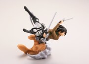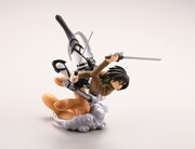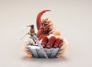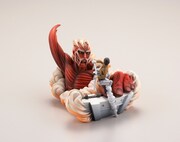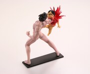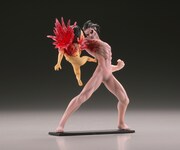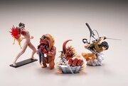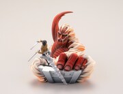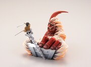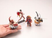 顔の表情や身体の造形はもちろん、ポージングや血しぶきにまでこだわって仕上げられたこのミニフィギュア。原型制作は榎木ともひでが手がけた。巨人の捕食シーンを立体化した「ヒトを喰らう巨人」や、立体機動を駆使して宙を舞うミカサを再現した「立体機動の戦士」のほか、「超大型巨人現る」「巨人化したエレン」の4種類がラインナップされている。価格は1回400円。