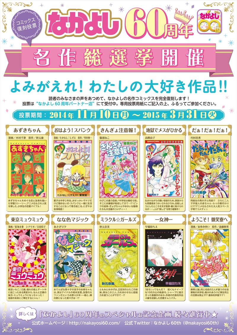 投票は全国の「なかよし60周年パートナー店」にて受付中。書店で配布されている専用の投票用紙を用いて、2015年3月31日までに応募しよう。パートナー店はなかよし60周年の特設サイトにて確認を。結果発表は4月28日発売のなかよし6月号にて行われ、2015年夏以降に復刻刊行される予定だ。