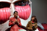 「進撃の巨人」初の大型原画展となる「進撃の巨人展」。エントランスを抜けると、巨人に襲われる恐怖感を音や光、風、振動などのギミックでリアルに体感できる「恐怖体感シアター」が待ち受ける。また会場には人を喰う巨人の恐怖が感じ取れる原画や、巨人に立ち向かう人類を描いたものなど、多数の原画がシーンごとに分けられ、諫山のコメントを添えて展示された。
