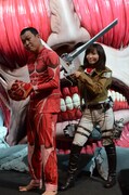 そのほか3Dシアター「360°体感シアター“哮”」では、兵団の一員となって立体機動装置の浮遊感を体験。これはHMD(ヘッドマウントディスプレイ)を使用し、360°どこを見ても映像が映し出されるというもので、巨人化したエレンを見上げたり、巨人に襲われたり、あたかもその場にいるような感覚をリアルに体感できる。