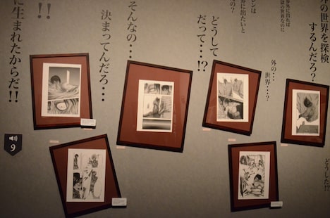 巨人化したエレンの戦いを描いた原画パネルに、映像や効果音、照明の演出を加えた空間や、女型の巨人との戦闘シーンを体感できる映像展示も。諫山自身にスポットを当てたコーナーでは、「UFC」「地獄先生ぬ~べ~」「ARMS」など諫山のルーツを紹介しているほか、作画風景の動画、幼少時からの創作物などが披露された。また諫山が19歳の頃に執筆した読み切り版「進撃の巨人」の原稿も飾られている。