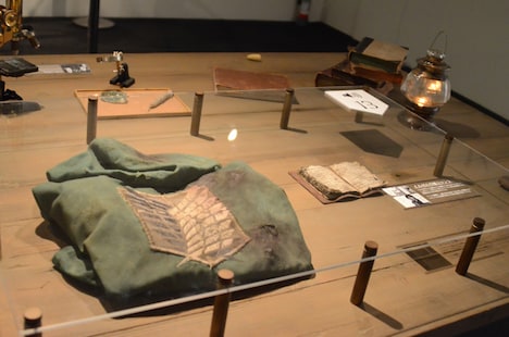 物語に登場するアイテムを再現したコーナーでは、ミカサのマフラー、エレンの立体機動装置、サシャの芋、イルゼの手帳とマント、リヴァイのブレード、エレンのスプーン、女型の結晶などが立体化されており、その世界観を体感することができる。立体物の展示を抜けると、諫山が展覧会のために描き下ろした新キャラクターの生原稿が。原作でもまだ登場していないこの人物は、物語の重要な鍵を握る男だという。