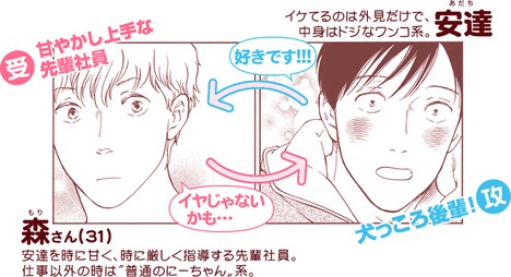 「こんなはずでは」は、背の高いイケメンだがドジでテンポのズレた犬っころ系の後輩・安達と、面倒見のいい31歳の先輩社員・森を描くほのぼのBL。on BLUEにて連載されていた。一方「からっぽダンス」は、惚れやすく気づいたらストーカーしてしまっている警察官と、男性アイドルにハマる残念美人OLを描くラブコメ。フィール・ヤング(祥伝社)にて連載中だ。