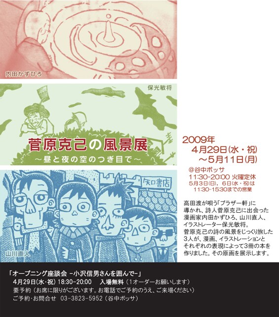 4月29日から5月11日にかけて、イベントスペース喫茶谷中ボッサで原画展「菅原克己の風景展~昼と夜の空のつぎ目で~」が開催される。