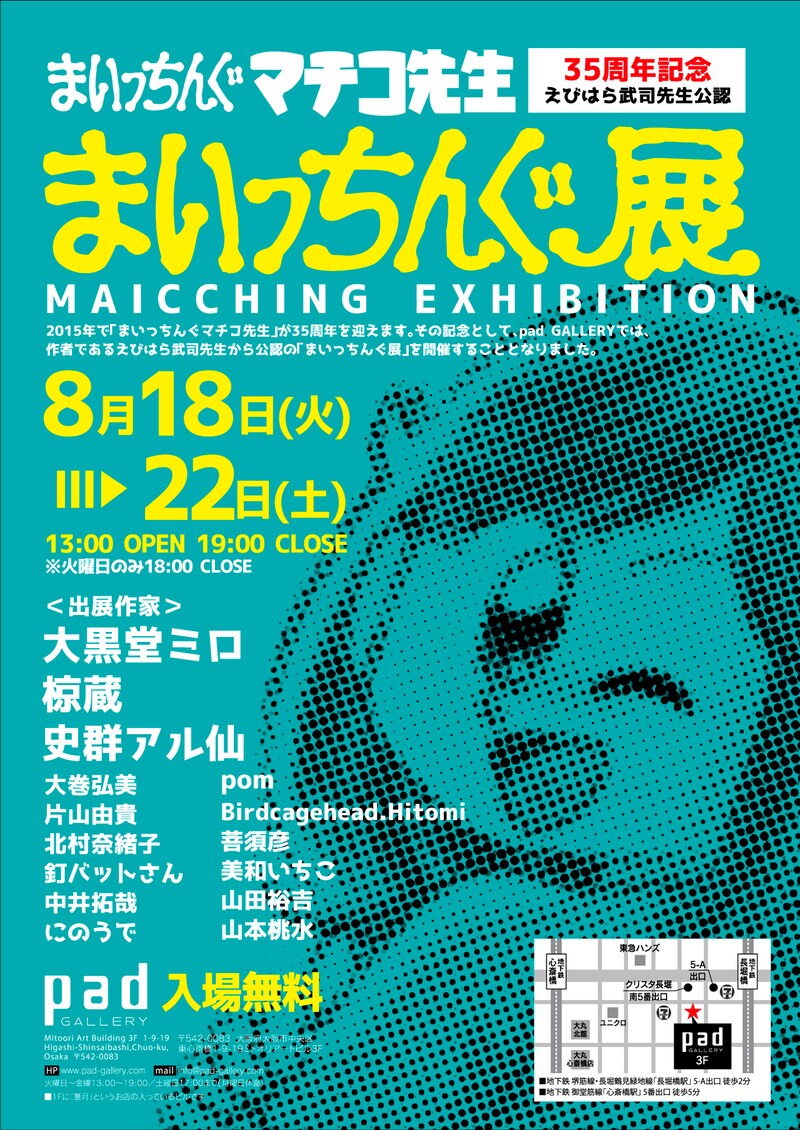8月18日にはロフトプラスワンウエストで、えびはらを迎えてのオープニングパーティーも実施される。史群アル仙、大黒堂ミロ、椋蔵もゲストとして出演し、「まいっちんぐマチコ先生」についてトークを展開するほか、えびはらの最新刊「藤子スタジオアシスタント日記 まいっちんぐマンガ道」の即売会も行われる。チケット予約はローソンチケットなどで目下受付中。