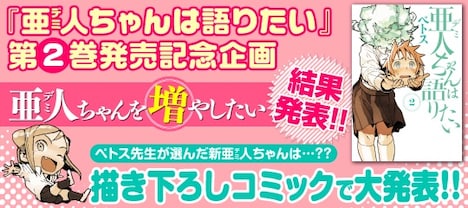 発売記念キャンペーンとして、ニコニコ静画内に設置されたヤングマガジンの公式マンガコーナー「ヤンマガ一家」にて、ペトスの描き下ろしマンガが明日より公開される。この番外編は読者から募集した新しい亜人のアイデアの中から選ばれた案をもとに、ペトスが執筆したもの。どんな亜人が登場するのか、ファンは期待して待とう。