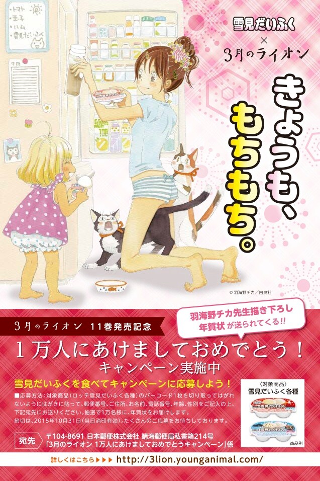 キャンペーンでは、雪見だいふく各種のバーコード1枚をはがきに貼って応募すると、抽選で1万人に羽海野の描き下ろし年賀状が届く。締め切りは10月31日。なお9月25日に発売される「3月のライオン」11巻の初版分には、「雪見だいふく×3月のライオン」のオリジナルイラストが入ったチラシが挟み込まれる。