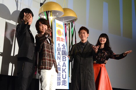 舞台挨拶の最後には、10月3日の封切りから10月11日までの9日間で、観客動員数が50万人を超えたことが発表に。これを受け神木は「ホントにたくさんの方に観ていただいて、感謝の気持ちでいっぱいです。みんなで必死になって作り上げた作品なので、『バクマン。』って映画よかったよねと今後も皆さんの心の中に残ってくれればいいなと思います」と思いを口にする。佐藤も「映画公開後の評判がすごくよくて、改めてこんな素敵な映画に自分が出れたことがどれだけ幸せなのか感じています。これからもっと頑張っていかなきゃと思いました」と決意を口にした。