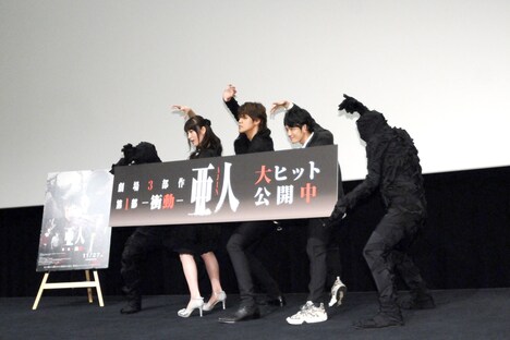 「亜人 -衝動-」は、決して死なない新種の人類“亜人”と、彼らを追う日本国政府の戦いを描く3部作の1作目。宮野、小松による挨拶に続き、第2部「亜人 -衝突-」からキャストに加わる福山が「どうも! ご存知、中野攻役の……」と名乗ろうとすると、すかさず宮野が「あなた新キャラやないかい!」とつっこみ、序盤から和気あいあいとしたトークが繰り広げられた。