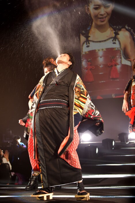 続いて外国人男性モデルを引き連れた高嶋と、花魁風の着物女性とともに濱田、獅子を従えた藤ヶ谷がそれぞれランウェイを歩く。劇中で「サル君」と呼ばれる秀吉役の山田は、4組の猿まわしと一緒にあらわれ会場を沸かせた。また向井は戦国武士と、柴咲は着物女性と、小栗は水着の上に甲冑をまとった女性とランウェイに登場。小栗はセンターステージにたどり着くと、天を仰ぎながら口に含んでいた水を吹き出し、観客を盛り上げた。