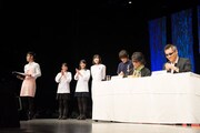 続いて行われたのは、目隠しをして食べたAとBの肉から、より値段が高い方を選ぶテイスティング対決。松岡が目隠しをした高橋の口に肉を運ぶ際には、アクションの面白さに司会の櫻井が「企画物みたいになっています(笑)」とつぶやく。その後試食する順番を迎えた花江が、小野にキスを求めるような顔で近づき会場を笑わせた。試食を終えた4チームは、諏訪部を除きAと回答。「あえてBで」と語る諏訪部は「Bのほうが硬いんで食べにくい肉ですけど、この年齢になるとBの肉くらいのほうがいいんですよね。Aのほうがほぐれやすくて脂も多いですけど」と自身の好みで選んだことを説明する。その言葉通りAが高級な肉であることが発表され、諏訪部を除く3チームにポイントが加算される。