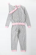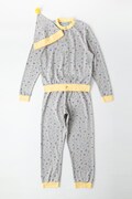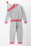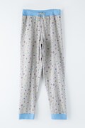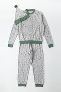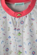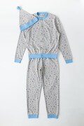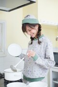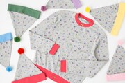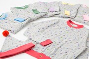 登場したのは、カーディガン、パンツ、ナイトキャップの3点がセットになったルームウェア。6つ子のモチーフが散りばめられ、各キャラクターのイメージカラーにあわせて6色が展開されている。キュートな松マーク型のボタンもポイントだ。
