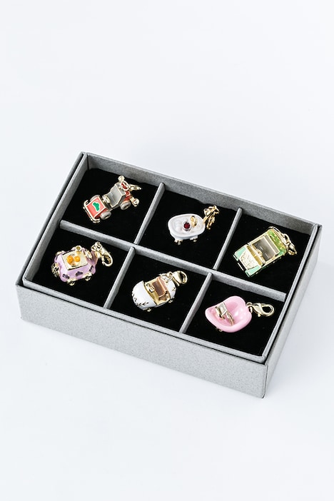 ネックレスチャームは、アニメ第18話「逆襲のイヤミ」にて、6つ子それぞれが乗車していたカートをモチーフに制作。おそ松の「おそカート」、カラ松の「カラ松A GO GO」、チョロ松の「チョロシコスキー」、一松の「ドテラねこ」、十四松の「ザ・ブルペン」、トド松の「トッティワゴン」が、精巧に再現されている。その日のファッションや気分にあわせてチャームを選び、“松スタイリング”を決めてみては。