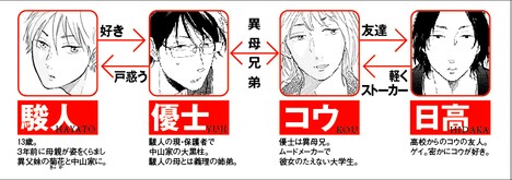 on BLUE(祥伝社)にて連載中の同作は、中学生の甥に思いを寄せられ困惑する叔父を描いたBL。叔父兄弟と甥姪の少し複雑な4人暮らしでなんとかうまくやってきた中山家だったが、駿人が叔父の優士に好きと伝え、キスをしてから関係が動き出す。なお1巻の新装版には、on BLUEに掲載後単行本未収録だった「宇田川町で待っててよ。」の特別編が掲載された。