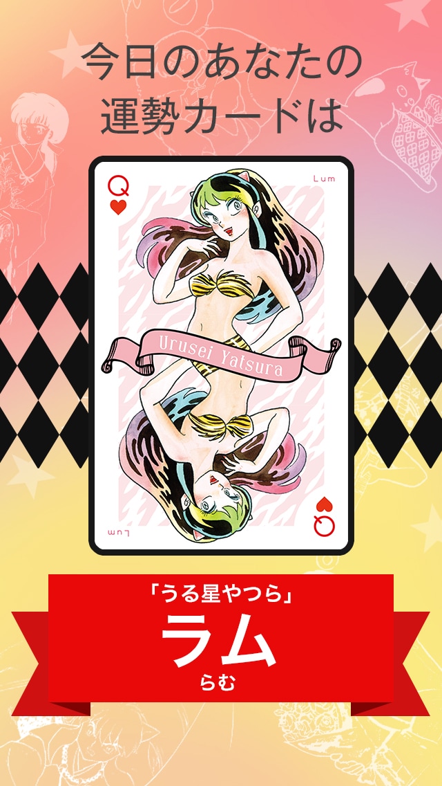 高橋の単行本が、全世界累計発行部数2億冊を突破したことを記念しオープンした同サイト。総計100以上のキャラクターが登場する「るーみっくわーるどトランプ占い」では、今日の運勢が占えるほか、各キャラクターが活躍する作品の試し読みも可能だ。さらに占いで引き当てたキャラクターのトランプを集めることで、「2億冊突破記念」の壁紙がゲットできる。占いは1日3回までプレイでき、SNSで占い結果をシェアすることで遊べる回数が増えていく。