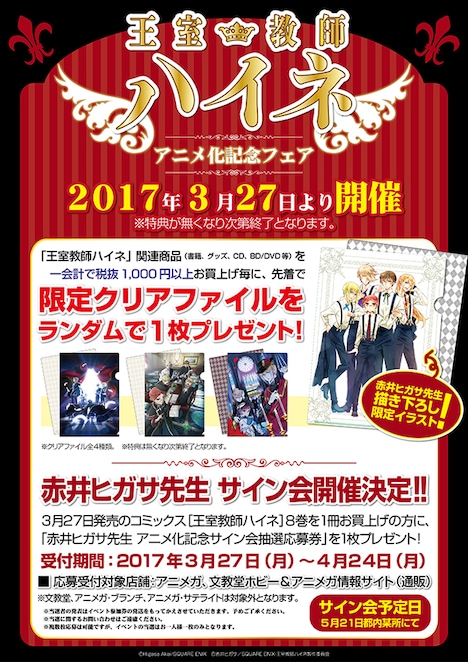 なお3月27日より文教堂・アニメガ各店にて「王室教師ハイネ」関連商品を1000円分購入するごとに、全4種類の限定クリアファイルをランダムで1枚プレゼント。そのうちの1種には赤井描き下ろしによるイラストがあしらわれている。詳細は文教堂・アニメガの公式サイトにて確認しよう。