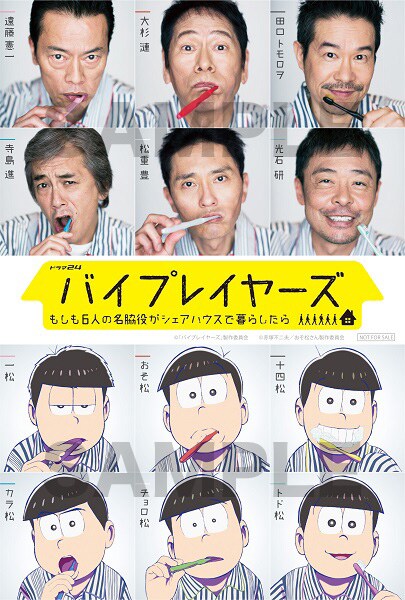 去る3月には「おそ松さん」の6つ子が、「バイプレイヤーズ」の6人になりきったビジュアルを制作し、コラボしていた2作。今回はエイプリルフール企画として「『おそ松さん』の30年後を、まさかの実写化!」という見出しとともに、ドラマ「バイプレイヤーズ」のキャスト陣が6つ子に扮する姿をアニメ「おそ松さん」の公式サイトにて公開した。「バイプレイヤーズ」の6人それぞれの性格にちなみ、おそ松役は