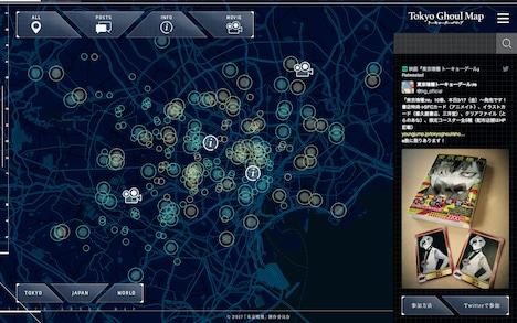 このほかGoogleマップのAPIを利用した「Tokyo Ghoul Map」と題したWebサイトが、4月28日12時にオープンすることも決定。「東京喰種」の関連ワードをスマートフォンやPCからツイートすることで、自分のツイート場所がピン立てされるほか、投稿数によるランキング上位者へのプレゼントなどが予定されている。