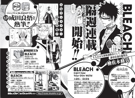 成田良悟による久保帯人「BLEACH」のノベライズ「BLEACH Can’t Fear Your Own World」が、少年ジャンプ+および「BLEACH 無料連載公式アプリ」にて、4月28日より連載されることが決定した。全7回を予定しており、隔週金曜日に更新される。[続きを読む]
