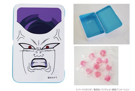 タオルハンカチは3枚セットで、それぞれに異なる表情のフリーザをプリント。缶入りキャンデーはフリーザの怒り顔が印象的なデザインだが、中を開けるとかわいらしい「いちごみるく味」の飴が10粒入れられている。そのほかマシュマロやモバイルバッテリーも取りそろえられている。
