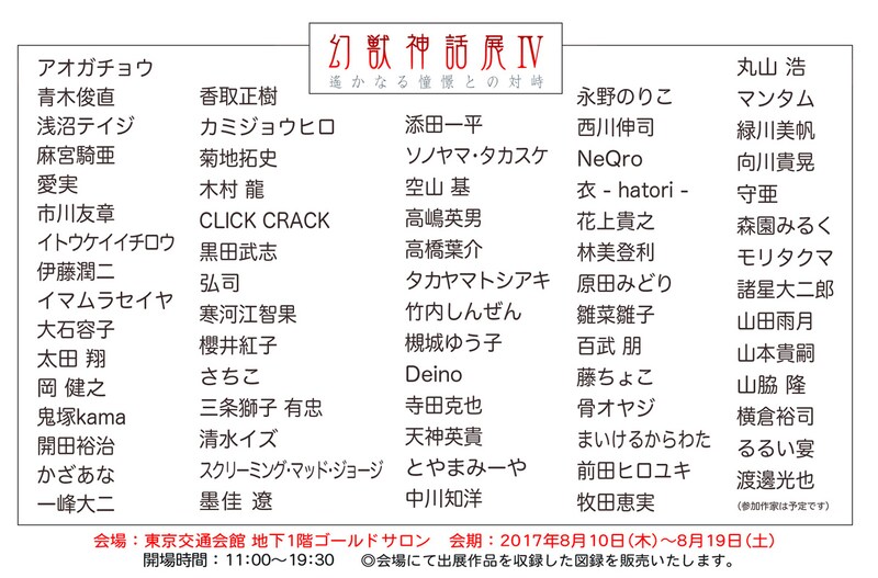 「幻獣神話展」はさまざまなジャンルで活躍するアーティストたちが、“幻獣”というテーマを自由に表現した作品を展示、交流するイベント。怪獣絵師の開田裕治と現代アート作家のマンタム、画廊・スパンアートギャラリーの3者が発起人となり、例年この時期に開催している。第4回となる本展にも、