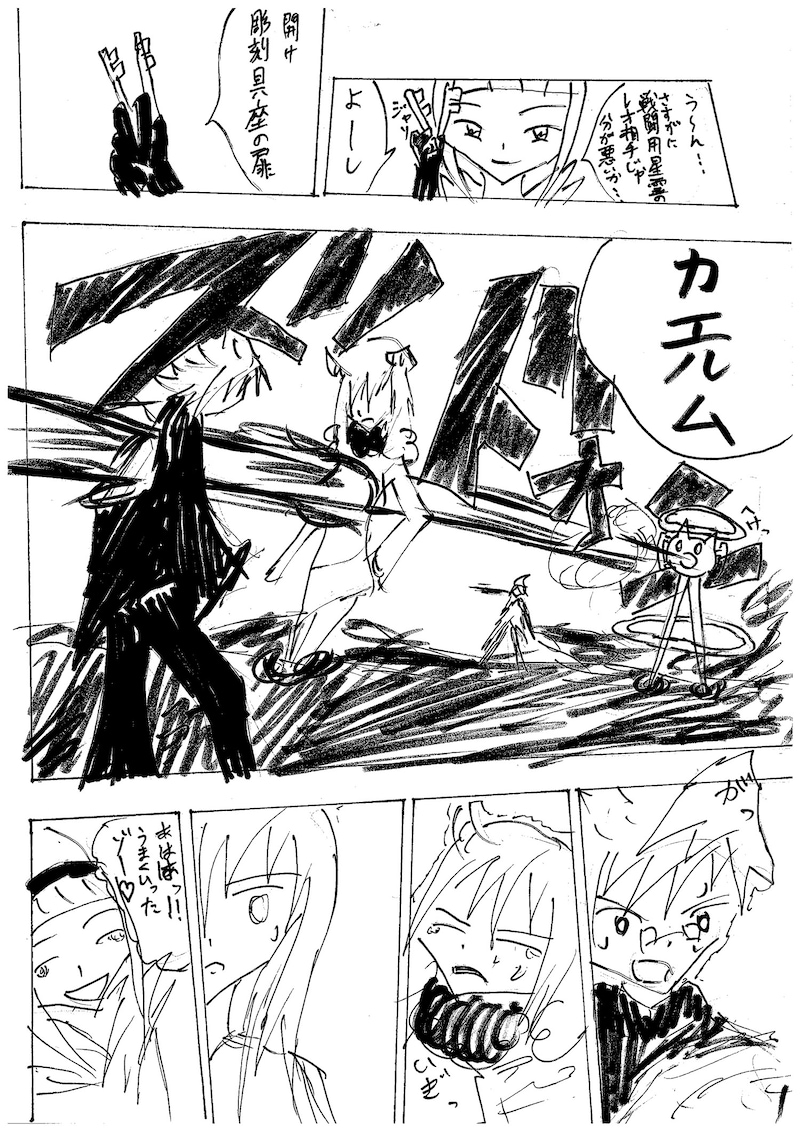 続いて絵柄については、西島が行った赤松健「魔法先生ネギま!」の模写を紹介。それぞれ30分、15分、1分で描いた模写を見ると、荒っぽい15分バージョンにもっとも西島の持ち味が出ていた。これをもって両講師は「ていねいに巧みに描くばかりがマンガではない」と主張。ならば、と大谷は手元にあったマンガ雑誌の1ページをスケッチブックに模写し始めた。