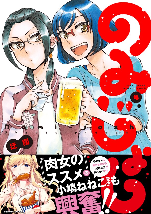 「のみじょし」は独身OL・高瀬道子(みっちゃん)を中心に、その友人でジム通いと筋トレが趣味の独身書店員・宮内美園、2児の母・東雲ゆきというお酒大好きなアラサー3人の日常を描く呑兵衛女子コメディ。4巻では、手作りしたさわらの昆布じめの美味さに家で1人で大騒ぎしたり、こたつに入りながら夜桜が見られるお花見座敷に会社の同僚と出かけたり、自宅でも外でも楽しい飲みライフを過ごす様子が描く。また「肉女のススメ」の小鳩ねねこによる寄稿も収められている。