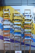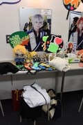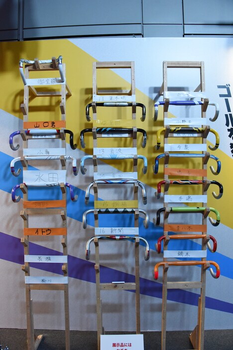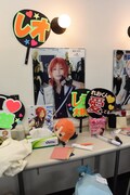 続く舞台「弱虫ペダル」のエリアでは、小野田坂道のママチャリや各校のユニフォーム、舞台で出演者が握りしめるロードバイクのハンドルを展示。作品ごとにどの俳優が出演していたのかがひと目でわかる、大きなパネルも用意された。さらに進むと、「あんさんぶるスターズ!オン・ステージ」の楽屋コーナーへ。キャストの楽屋を再現した展示のほか、Knights、ナイトキラーズ、そして劇中で月永レオがKnightsの王様として帰還したシーンで用いられた椅子も並んでいる。