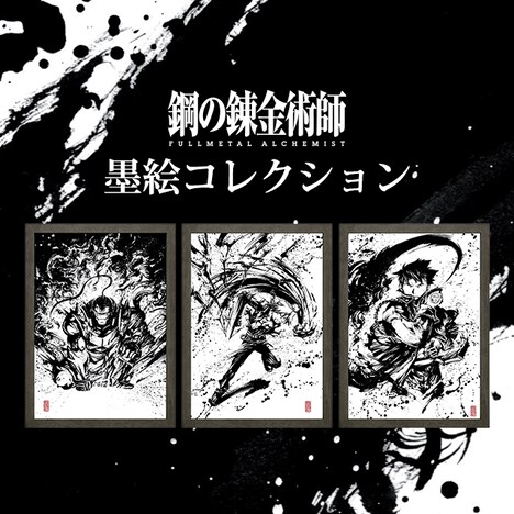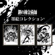 「鋼の錬金術師 FULLMETAL ALCHEMIST 墨絵コレクション」は、墨絵師・御歌頭が描き下ろしたエドワード・エルリック、アルフォンス・エルリック、ロイ・マスタングの墨絵を和紙にプリントしたもの。独特のタッチで描かれた墨絵は、今にも動き出しそうな躍動感のある仕上がりに。商品は額装入りで届けられる。