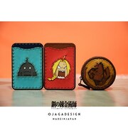 またレザーブランド・OJAGA DESIGNとのコラボアイテムも登場。エドとアルの印象的な表情を立体的に再現したパスケースと、エドが持つ懐中時計をイメージしたコインケースが用意された。