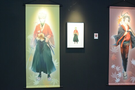 会場の入り口では、本展のために描き下ろされた各キャラクターイラストがお出迎え。続く「各キャラクターゾーン」では舞台で実際に使用された衣裳や小道具、舞台中の写真が、原作のイラスト・デッサン画などと合わせて展示された。