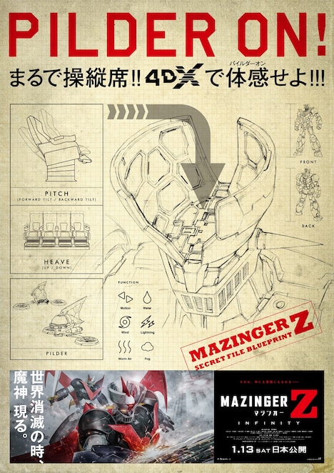 「劇場版 マジンガーZ / INFINITY」は1月13日ロードショー。4DX、MX4D、D-BOXといったアトラクション型の上映システムを有する劇場でも公開され、4DX版の入場者にはポストカードがプレゼントされる。