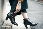 一方ブーティはアレンや神田、ラビが着ている団服をイメージ。ツヤ感のある合皮の生地に赤いボタンが配されており、パイピングも施されている。このほかゴールドのチャームもあしらわれた。