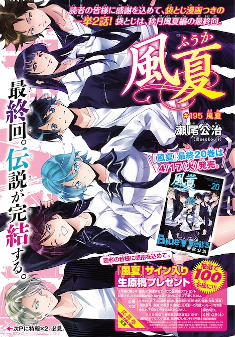 2014年2月より同誌にて連載開始した「風夏」は、人を惹きつける魅力を持つ少女・秋月風夏と、内気な少年・榛名優が出会ったことから始まる物語。2017年1月にはテレビアニメ化された。単行本は19巻まで発売中で、最終20巻は4月17日発売。今号には本編の最終回とともに「秋月風夏編」の最終回が袋とじで収められた。