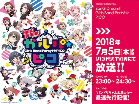 またミニアニメ「BanG Dream! ガルパ☆ピコ」が、7月5日よりTOKYO MXほかにて放送されることも発表に。「ガルパ☆ピコ」ではスマートフォン向けゲーム「バンドリ! ガールズバンドパーティ!」のキャラクターたちが、ミニキャラとなって大暴れする。DMM.futureworks×サンジゲンがアニメーション制作を手がける。