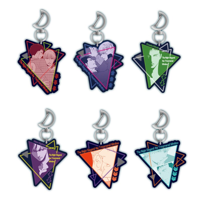 ラインナップされたのは「ネオンアクリルマスコット」と「さんかく鏡と巾着セット」の2アイテム。「ネオンアクリルマスコット」は全6種類。本作の印象的なコマやイラストをネオン風の色合いでデザインし、ホルダー部分には月型のナスカンが付いている。