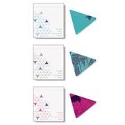 「さんかく鏡と巾着セット」は3色展開。三角形のアクリルミラーの表面に、いずれも三角と冷川がペアでプリントされている。巾着はシンプルな幾何学模様にデザインされた。価格はアクリルマスコットが各864円、「さんかく鏡と巾着セット」が各1620円となっている。