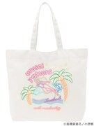 袖口にフリルがあしらわれたTシャツ、キャンバス素材のトートバッグ、ブルーのポーチには、イルカと戯れる水着姿のラムがネオン風の色合いでデザインされた。ポーチは背面にテンがプリントされており、星型のチャームがアクセントとなっている。