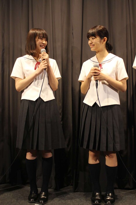 南は吃音により言葉が上手く話せない志乃というキャラクターを演じるにあたり、吃音の人々に取材をするなど準備を重ねたと明かす一方で、「実は小さい頃からセーラー服に憧れていて、劇中で制服を着ることができてうれしかったです」とセーラー服への思いも告白。そんな志乃が心を開いていく友人・加代を演じた蒔田は、志乃とのやり取りについて「演じる際は、言葉が上手く話せない志乃が言葉や気持ちを伝えきるのを待ってから答えることを心がけました。コンプレックスを抱えてきた加代なら、笑われたり遮られるのがどれだけつらいかわかっているはずだから」と演技をするうえでのポイントを語った。
