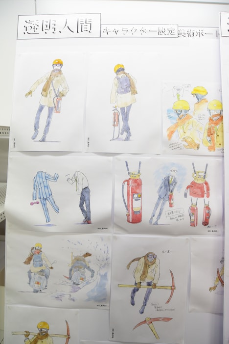 3本の短編の中で、最も早く完成したという「透明人間」は、山下にとって初となるオリジナル短編映画。周囲の人間はもちろん、自動ドアやATMにも認識されない透明人間の存在を表すために、雨粒や体にまとわりつく木の葉が演出として用いられた。西村は「山下さんは人間を動かすのが天才的にうまい。だからこそ、目に見えない透明人間をどう表現するのかが見たかった」と述懐する。同作のイメージボードには、主人公が持ち歩く消火器の設定や、服装の描き方などについて細かいメモが残されていた。