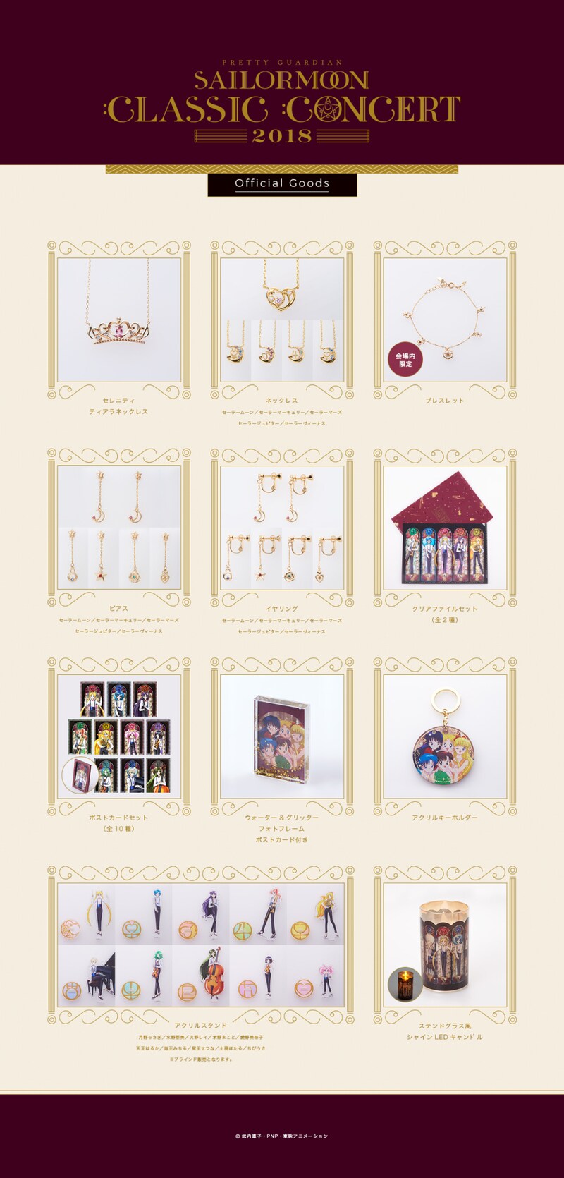 8月28日・29日に東京・東京芸術劇場、9月7日に大阪・フェスティバルホールで行われる「美少女戦士セーラームーンClassic Concert 2018」。グッズ第1弾にはパンフレットやポストカード、クリアファイルといった定番アイテムのほか、昨年も販売されたジュエリーブランド「THE KISS」とのコラボアクセサリーの新シリーズ、会場限定販売商品などが用意された。