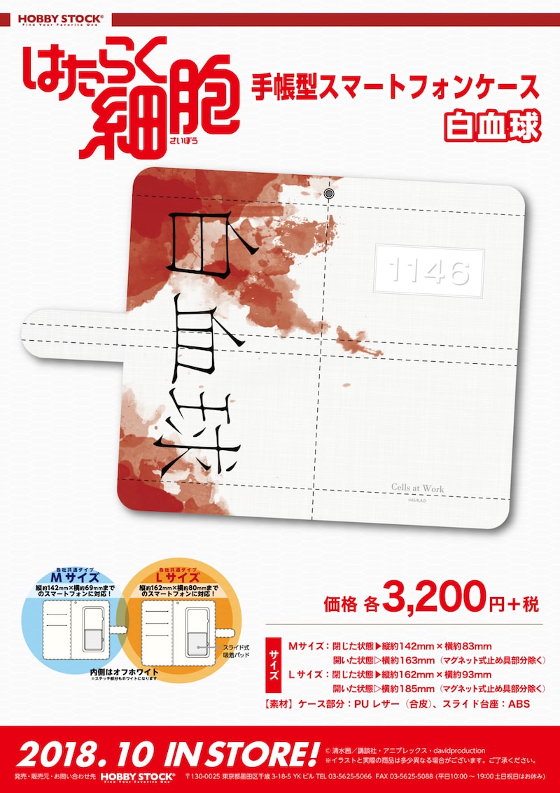 ラインナップは手帳型スマートフォンケース、アクリルキーホルダー、シャープペンシル、マルチクロス、クリアファイルセット、缶バッジコレクションの全6種。「はたらく細胞 手帳型スマートフォンケース」は白血球をイメージしたデザインで、白を基調に「1146」というタグや“白血球”という文字、血などがあしらわれている。吸着パッドで端末を取り付ける仕様のため、機種を選ばず装着可能。MサイズとLサイズが用意されており、価格は各3456円だ。