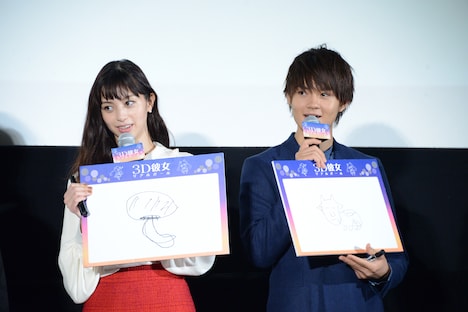 本日のイベントでは撮影の合間にキャスト陣の間で盛り上がったという、絵しりとりをするコーナーも。同作に登場する筒井が愛してやまないアニメキャラ・えぞみちから始まり、ゆうたろうが次の絵を描くことに。するとゆうたろうは「ち」ではなく「み」から始まる「みかん」を描いてしまい、2人目でしりとりが終了。急いで描き直すもフリップには「みかづき」の絵が描かれており、しりとりとして成立しなくなってしまう。