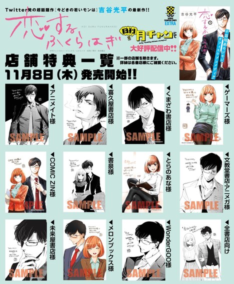 「今どきの若いモンは」の吉谷光平による「恋するふくらはぎ」は、童貞サラリーマンの見栄晴彦と、元ビッチのOL・表うららの関係を描いたオフィスラブコメディ。「お茶を飲みたいなら自販機があるのでは?」と考えてしまう徹底した合理主義の晴彦と、かつては男性からセフレ扱いされることも多かったものの、「次こそ誠実な人と出会いたい」と考えているうららはお互いに惹かれ合っている。うららは晴彦に積極的にアピールをするが、女性経験のない晴彦の真面目さと不器用さゆえに、2人はすれ違ってしまう。両思いの2人が、モジモジしながら徐々に距離を縮めていくさまが見どころだ。同作は秋田書店のWebマンガサイト・日刊月チャンにて連載中。
