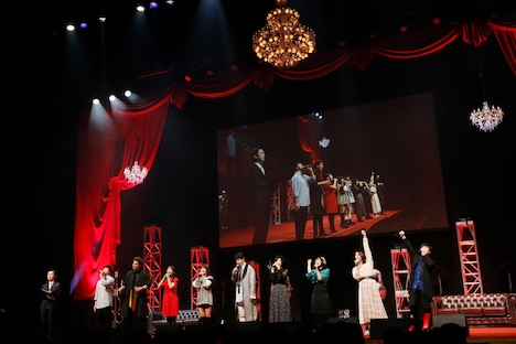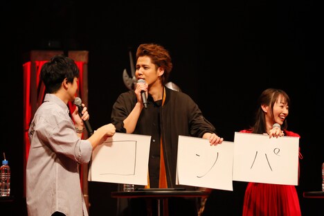 朗読劇にはMCの岩井も “仮面舞踏会”を主催する悪者役で参加。星型のレンズをしたメガネに首からヘッドホンをかけ、ハイテンションで役を演じる岩井の姿がスクリーンに映されると大きな盛り上がりを見せる。アニメにも登場したゴシップ記者の大宅一子が酔っ払ってクラブの奥の部屋に連れて行かれてしまうという場面まで物語が進むと朗読劇は一度終了し、ゲームコーナーが始まる。