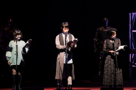 続く朗読劇は保志演じる明智の語りからスタート。イベントタイトルである「Masquerade Party」に絡め、事件解決のために渋谷のクラブで開かれている“仮面舞踏会”に潜入するというストーリーがキャスト陣の巧みな語りで展開される。怪しまれないように、クラブのノリに馴染もうとするキャラクターたちを演じる場面では、福山らがそれぞれオリジナルの踊りを披露。佐藤は正拳突き、宮野と戸松はステージを広く使いマイケル・ジャクソンの「スリラー」を思わせるようなダンスを2人で踊り観客からは大きな笑いが起こった。
