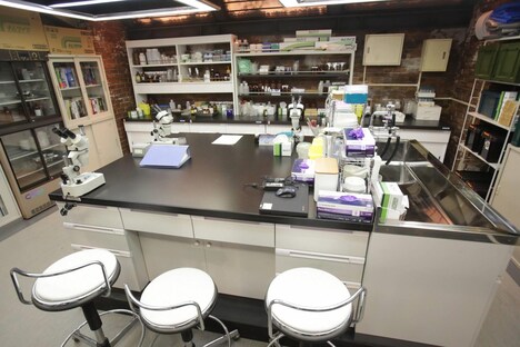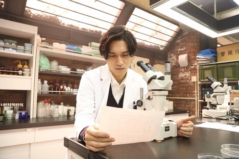 到着したのは、完成した科学捜査研究所のセットを捉えたものや、撮影の合間のオフショットなど計6枚。顕微鏡の前に座る科捜研法医研究員・真野礼二役の
