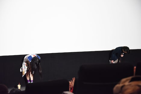 上映後には、原作者である橋口いくよと、勅使河原恭一役の新田将司が登壇。ついに上映初日を迎え、橋口は「今日は皆さんが、時空を超えて少年ハリウッドをこちらの世界に連れてきてくださった記念すべき日だと思います。シャチョウ、テッシー、キャット、初代(少年ハリウッド)、新生(少年ハリウッド)のメンバーと、時空の向こうのお客さん、そしてずっと応援してくださった皆さんのおかげで少年ハリウッドはここでライブができました。一緒に歩いてきてくれた人たちを代表して御礼申し上げます。本当にありがとうございました」と深々と頭を下げる。新田はクラウドファンディングに協力した支援者の名前がエンドロールに流れることに触れながら、「協力していただいた皆さんはもちろん、今まで応援してくださった世界中の方々の誰1人が欠けても、彼らのライブを観ることができなかったんだということを今日感じました。本当に感謝しかないです」と思いを述べる。