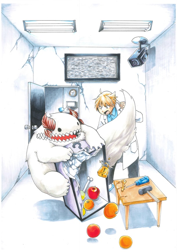 「赤点のかいじゅう」は若き天才科学者・零丸が、彼が作り出したキメラ・一太朗の能力を測るためさまざまなテストを行う試験コメディ。第1話では、時間までに鍵を入手できなければ首輪が爆発して死ぬという非情なテストが実施されるも、一太朗がルールを無視して怪力で首輪を引きちぎったことから始まる騒動を描く。