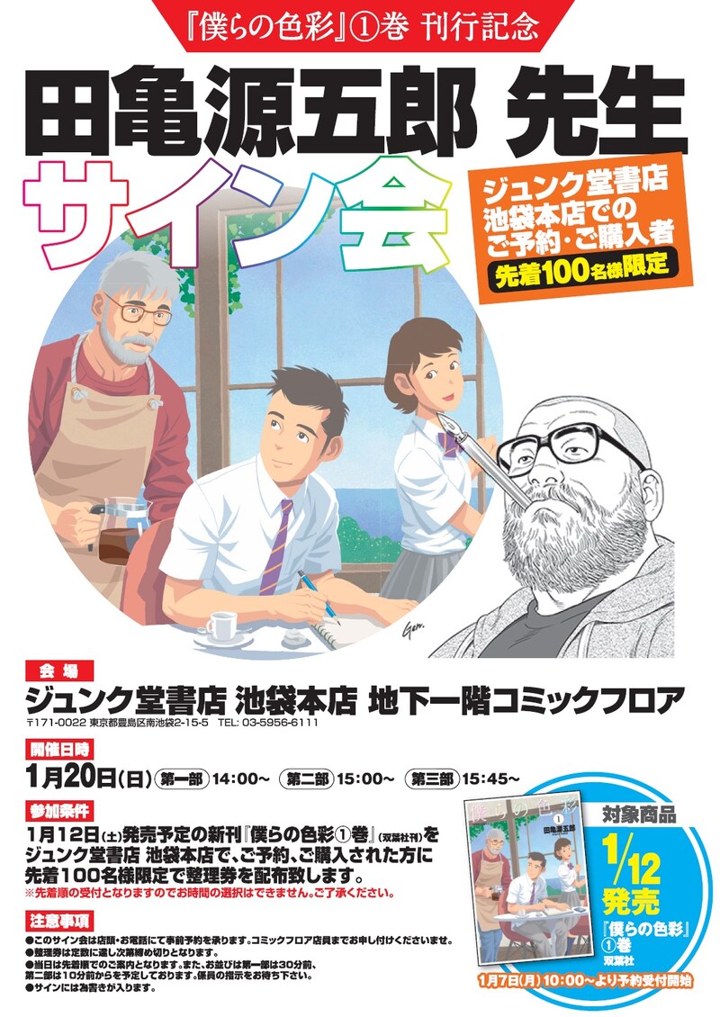 サイン会の整理券は、ジュンク堂書店池袋本店で「僕らの色彩」1巻を予約または購入した先着100名に配布。予約受付は本日1月7日にスタートし、1月12日から20日まで店頭にて整理券と引き換えることができる。詳細は店舗の特設ページにて確認を。
